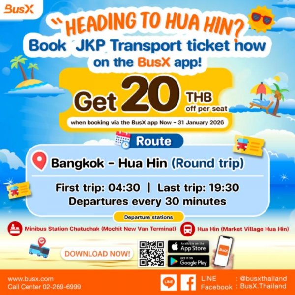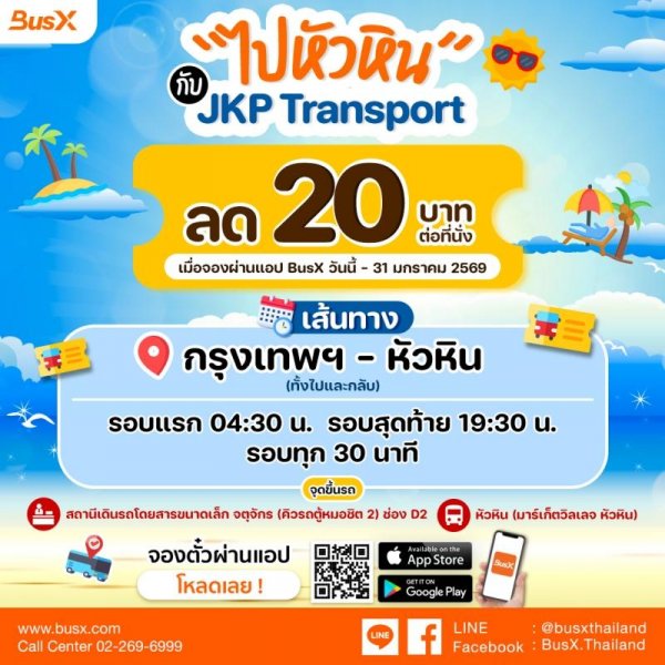 🔥จองผ่านออนไลน์ ลด 20 บาท เส้นทางกรุงเทพฯ-หัวหิน ทั้งไปและกลับ