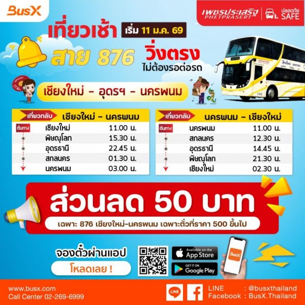 🔥โปรต้อนรับ สาย 876 เชียงใหม่ - นครพนมเมื่อซื้อตั๋วเพชรประเสริฐ ผ่านออนไลน์ ลดทันที 50 บาทเงื่อนไข