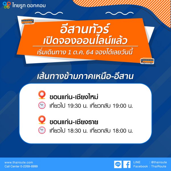 อีสานทัวร์ เปิดจองตั๋วออนไลน์แล้ว เริ่มเดินทางตั้งแต่ 1 ต.ค. 64 เส้นทางข้ามภาค ขอนแก่น - เชียงใหม่ , ขอนแก่น - เชียงราย ตรวจสอบมาตรการจังหวัดปลายทางที่